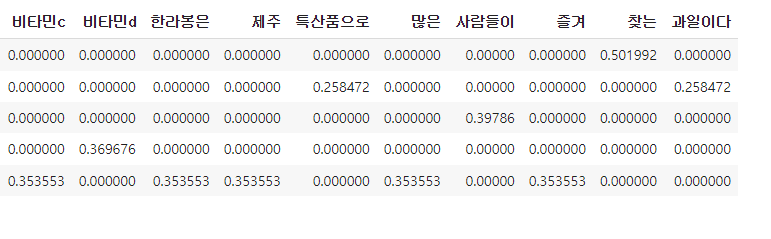 | 문서5 | 한라봉은 제주 특산품으로, 많은 사람들이 즐겨 찾는 과일이다. |