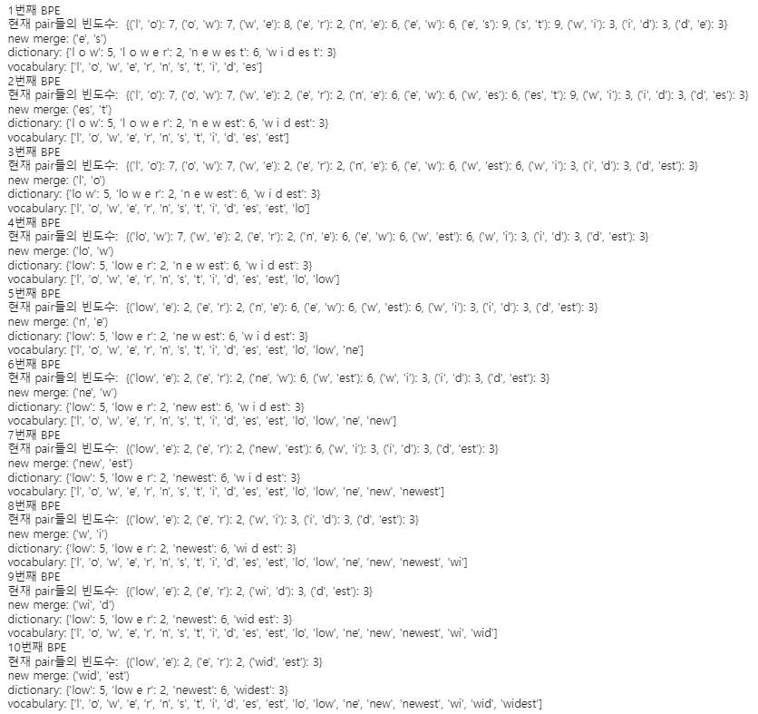 - 단어 사전의 각 단어를 공백을 기준으로 분리한 뒤, 연속된 단어 쌍을 찾아 빈도수를 계산한다.