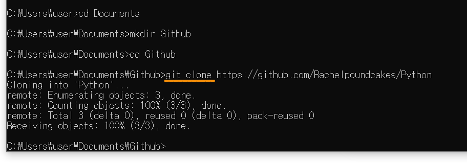 깃 다운로드 → 깃허브 계정 가입 후 repository 생성 → Github 폴더 생성 → cmd에서 Github 폴더에 git clone 깃허브 repository 주소 입력