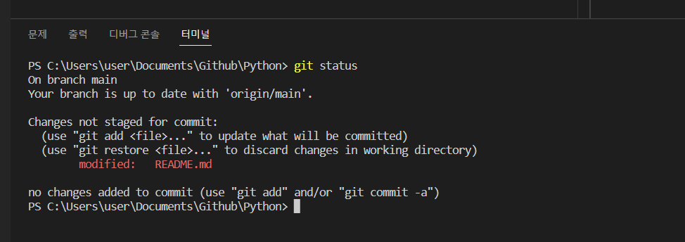 → git status 깃 상태확인 → 파일 git add로 추가 → git commit -m "업데이트 메모"