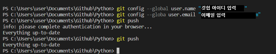 → Github 아이디와 이메일을 입력하여 Git과 연결하기 → git push로 깃허브에 저장하기