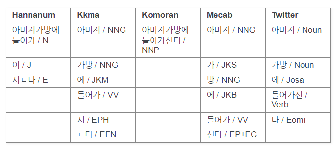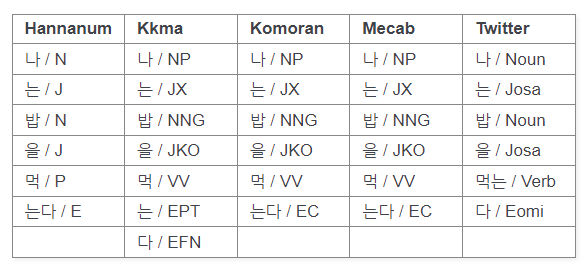 Korean POS tags comparison chart