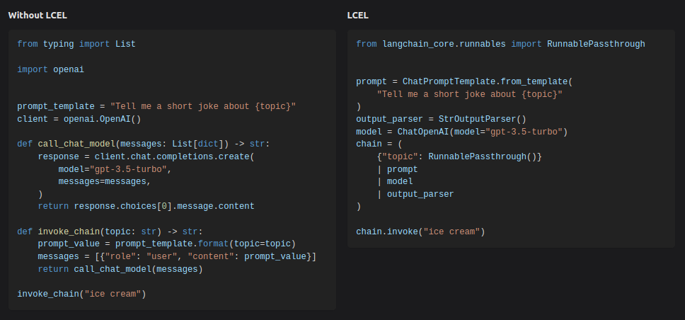 LCEL을 사용하지 않은 코드와, 사용한 코드를 눈으로 비교해보자.