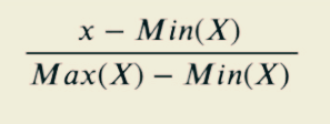가장 작은 값을 0, 가장 큰 값을 1로 두고, 나머지 값들을 0과 1 사이의 값으로 변환하는 것이다. x라는 값을 스케일링 한다고 하면, (x-최소값)을 (최대값-최소값)으로 나누어 준다. 예를 들어 x= 10, 최대값=50, 최소값=5라고 하면 (10-5)/(50-5)= 0.1이 된다.