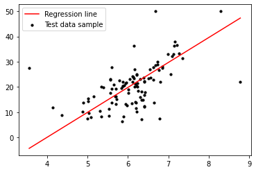 plt.legend(['Regression line','Test data sample'], loc='upper left')